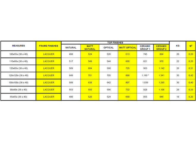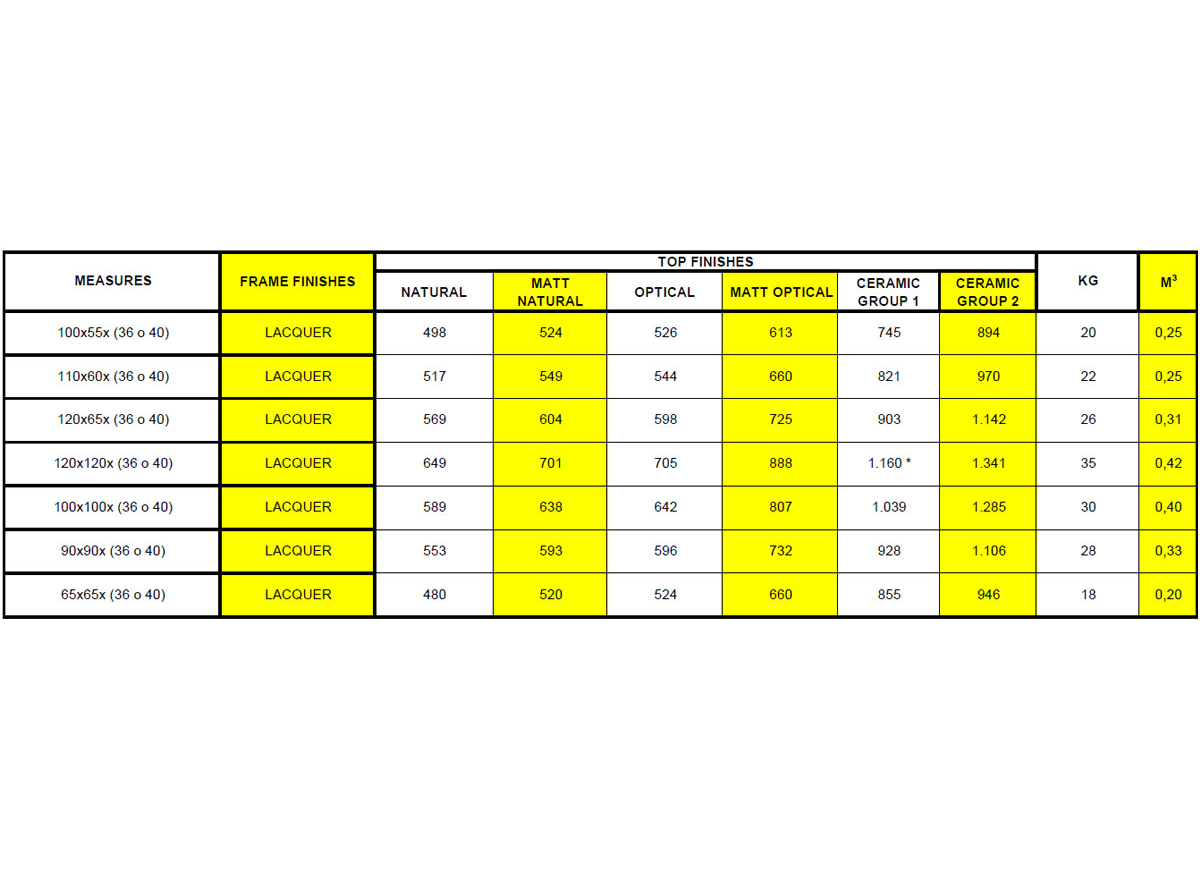 Kalos bianco and steel dark with a price supplement of 145 points/table on group 1.