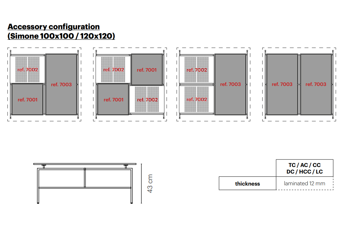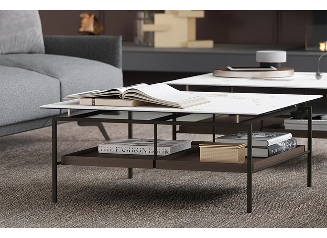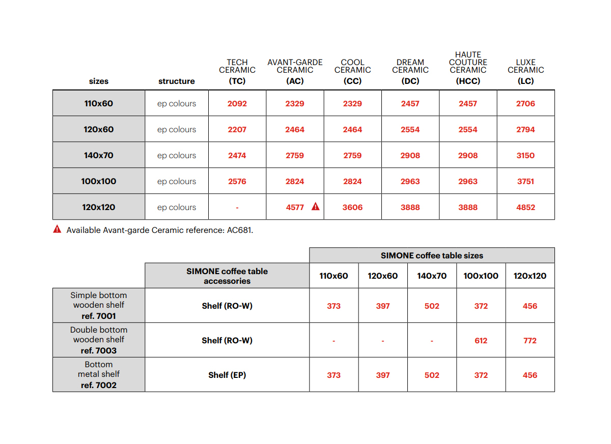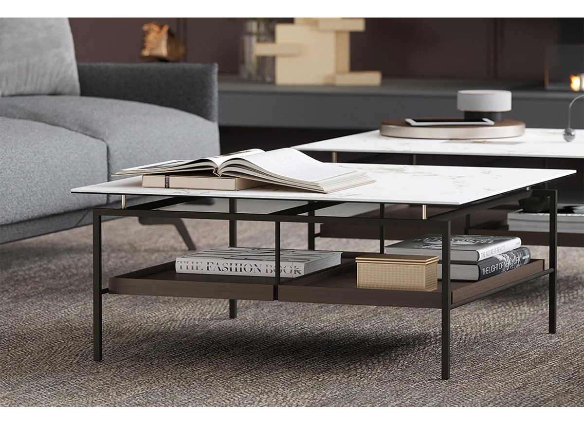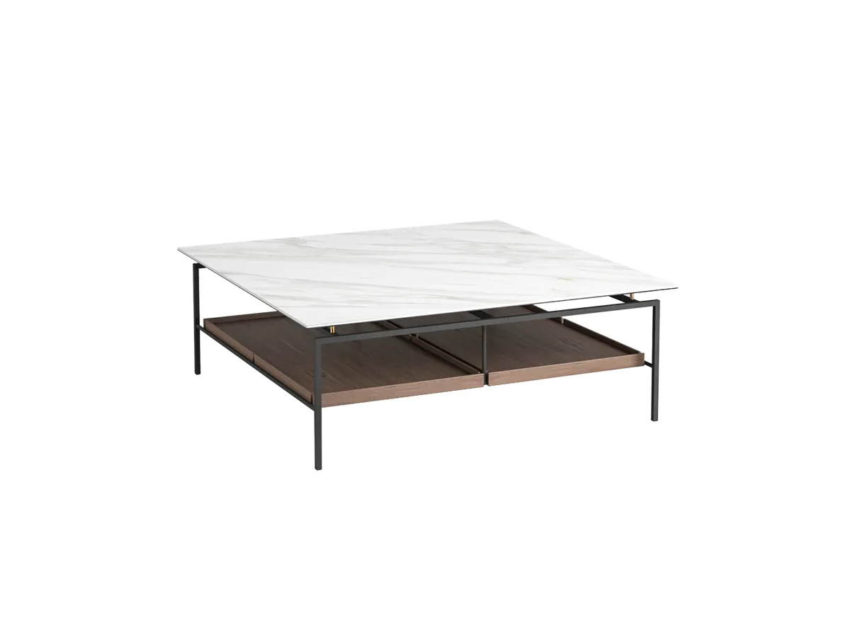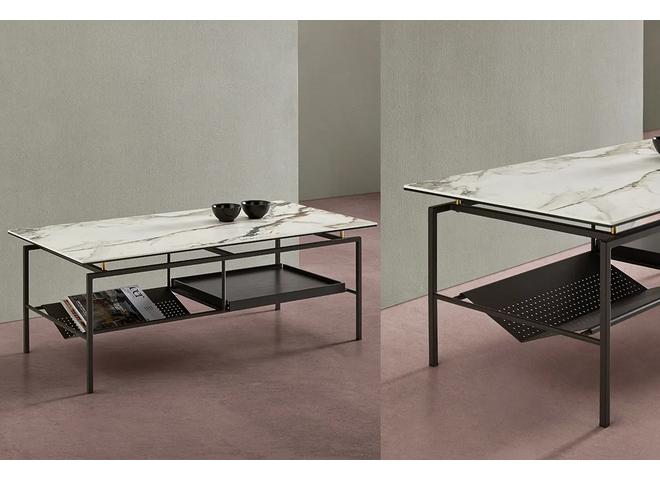 The Simone coffee table is 43 cm high with a ceramic top in a variety of sizes. This table can also be considered as a composition that each one can improvise thanks to the wide variety of finishes and the different accessories that can be added: bottom metal magazine and wooden shelves.