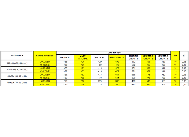 Kalos bianco and steel dark with a price supplement of 65 points/table on group 1.