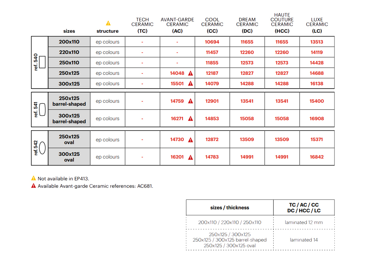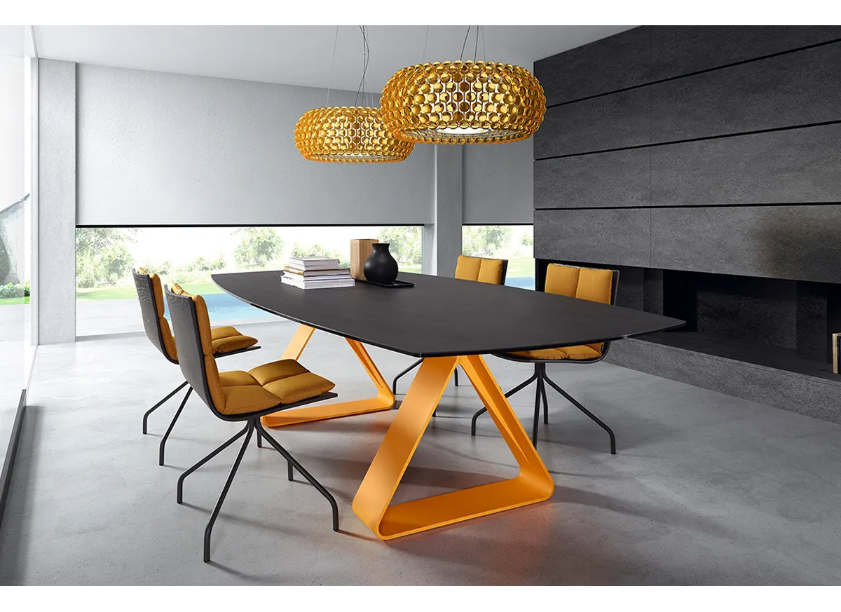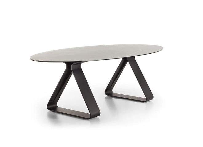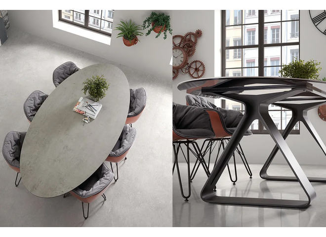 Fixed table with ceramic top available in rectangular, oval and barrel-shaped top. The structure is made of extruded aluminum.