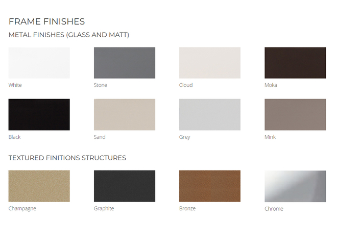 Brillant ou mat : Blanc, nuage, lin, sable, vison, pierre, moka, noir, gris.