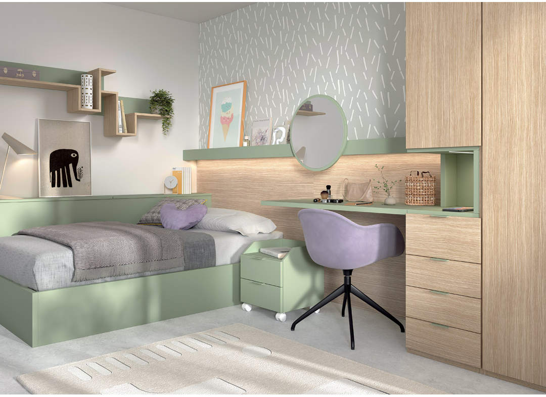 A complete bedroom solution designed for comfort, study, and storage in one cohesive composition. This setup combines a single bed with built-in storage, an integrated desk with shelving, and a full-height wardrobe, making it ideal for children’s and teenagers’ rooms. The clean lines, soft color accents, and functional layout optimize space while creating a warm and modern environment. Perfect for everyday living, this composition balances practicality and style in a compact footprint.