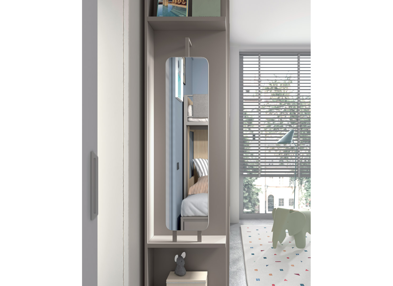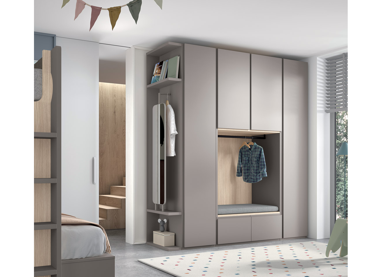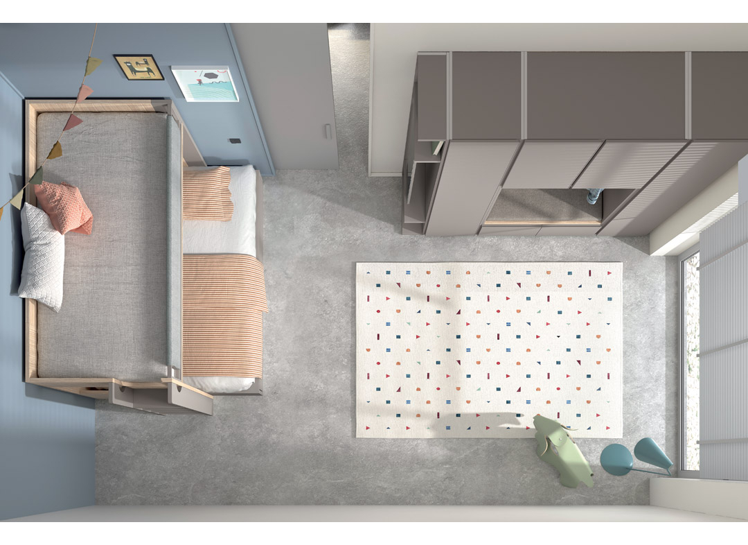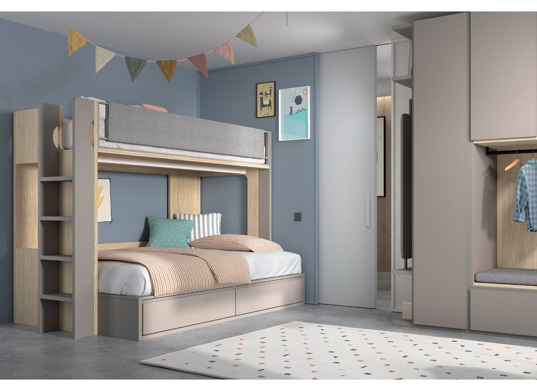 A smart, space-efficient bunk bed system designed for children’s and shared bedrooms. This composition combines a sturdy bunk bed with built-in wardrobes and open storage, creating a cohesive and functional wall solution. The integrated armoires provide ample space for clothing and everyday essentials, while the bunk bed maximizes sleeping capacity without sacrificing floor space. With its clean lines, soft colors, and practical layout, this system is ideal for modern family homes looking to optimize space with a stylish, all-in-one furniture solution.