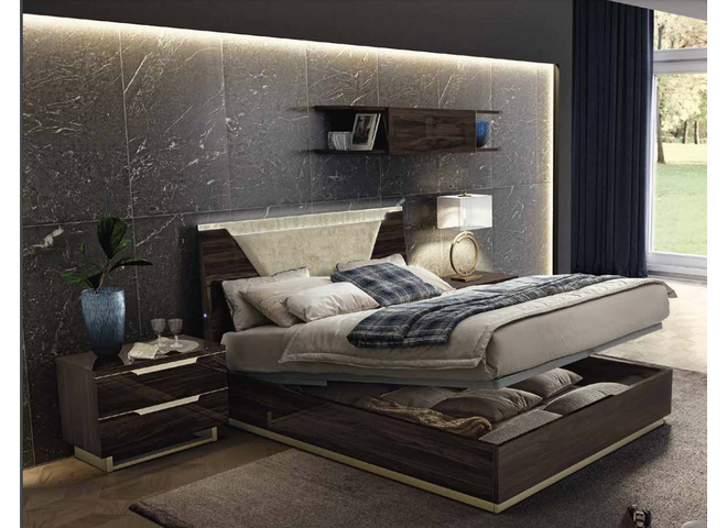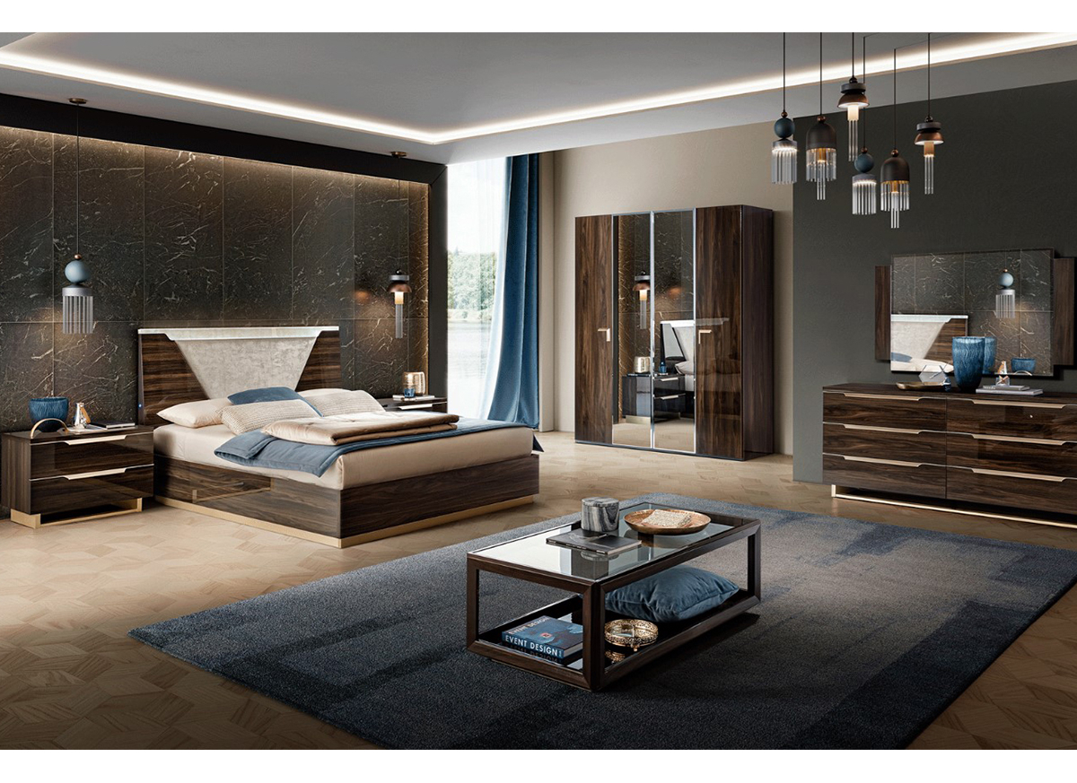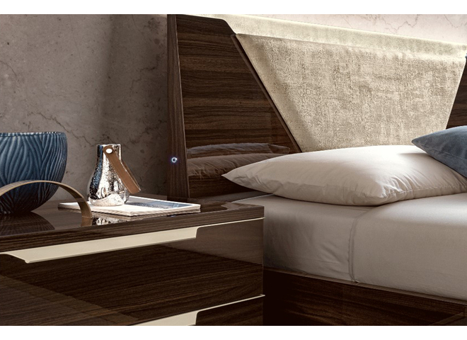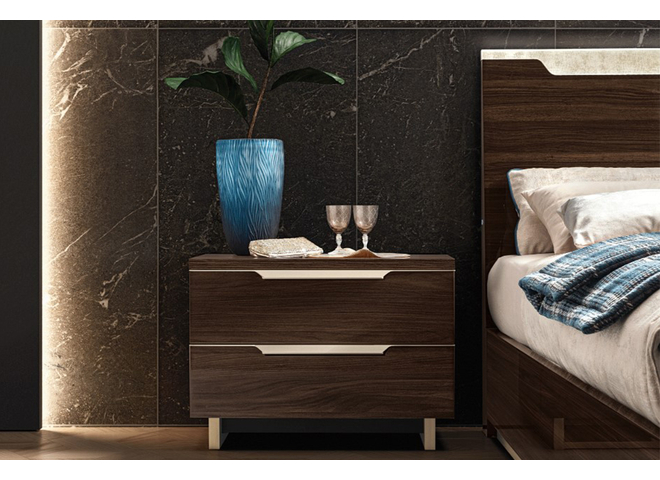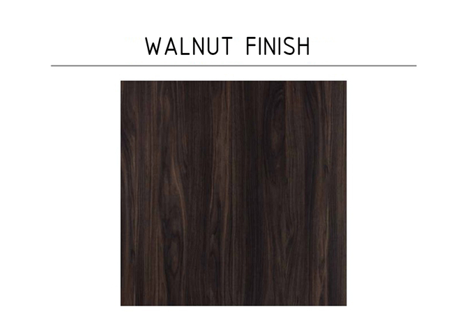 Warm shades walnut finish with streaked wood pattern give elegance and modernity to smart collection. Original triangle cut handles in Bleached, satin and brushed gold finish with matching plinths.
